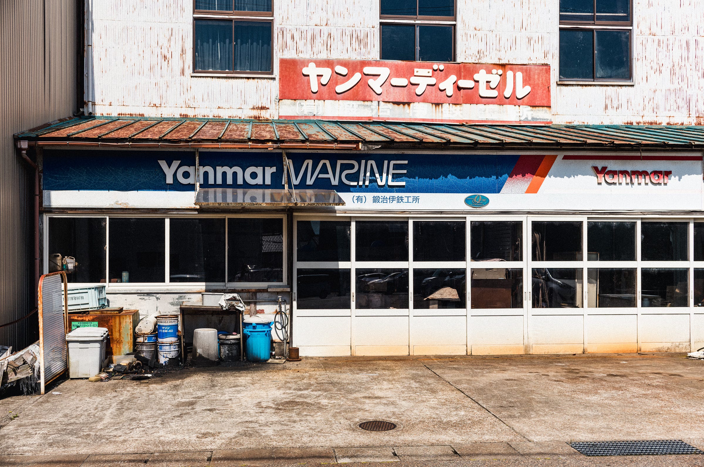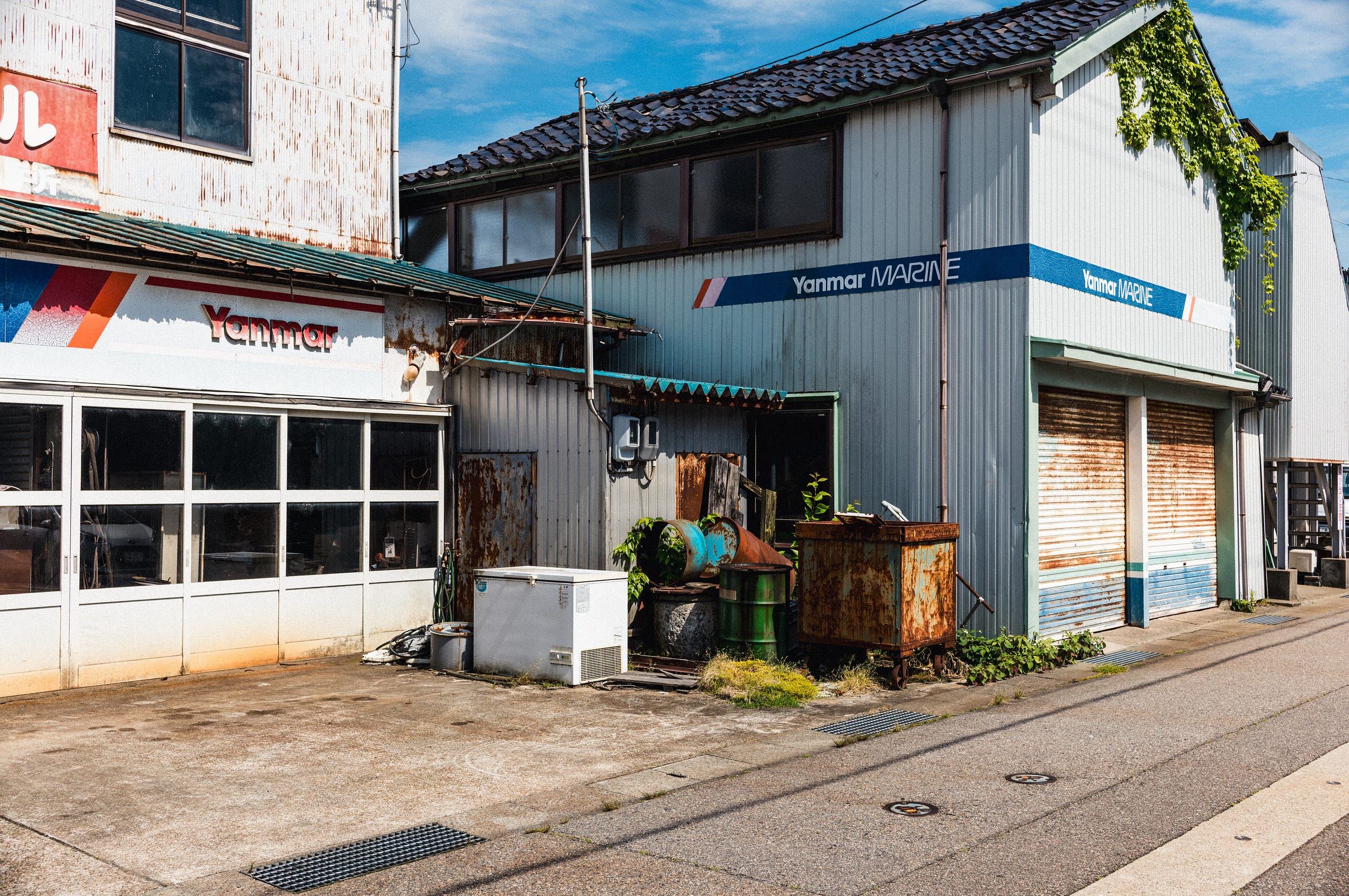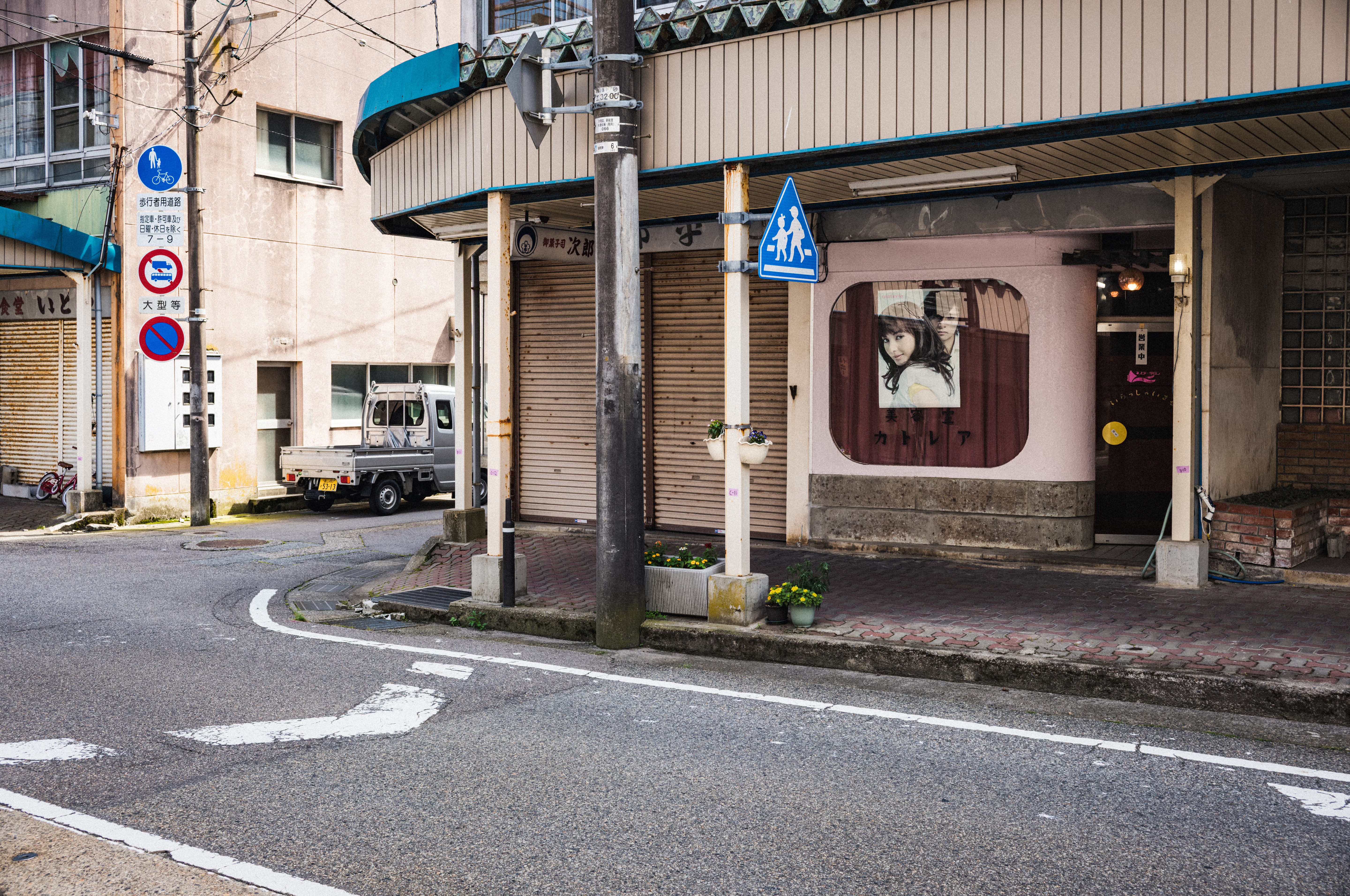 Himi City. A once-prosperous agricultural and fishing port town surrounded by idyllic nature, Himi shows the unmistakable signs of modern Japan’s post-Bubble-era fall from re-industrialization. With a general move towards centralization of industry to the main urban centres, modern heavy industry and tech. all but cease to exist here and the once thriving shotengai enclosed shopping streets and Ginza districts now sit empty and eerily quiet. Empty and desolate, shuttered-up shop fronts well past their prime dot the landscape; the signage and typography that remain hark back to a more colourful time, where optimism and local tourism were high and the bubble had not yet burst. A perfectly preserved relic, with Showa-era soft tunes and muzak drifting in from the still-operational PA megaphones and speakers—surprisingly crisp—yet playing to no one at all.