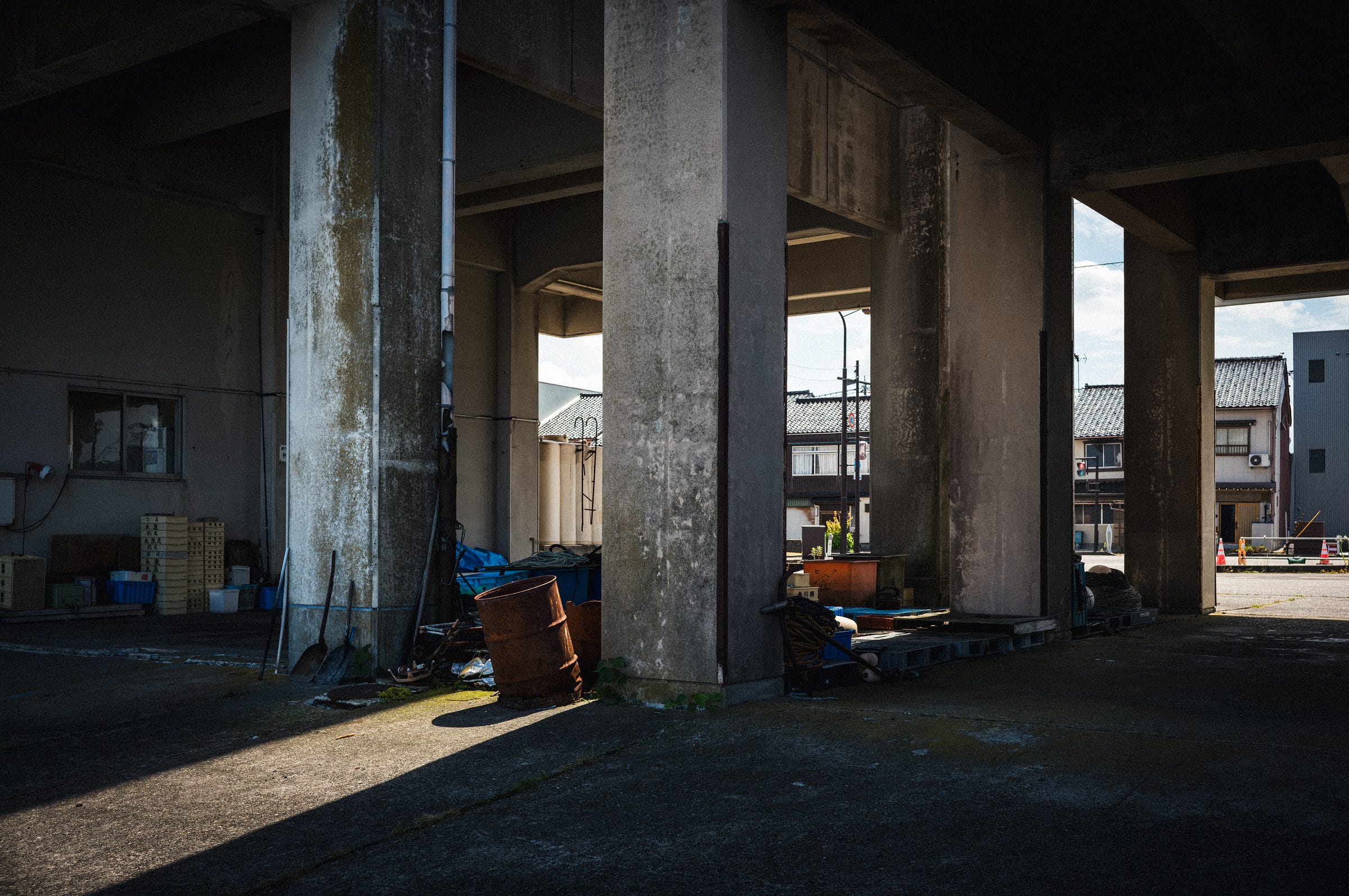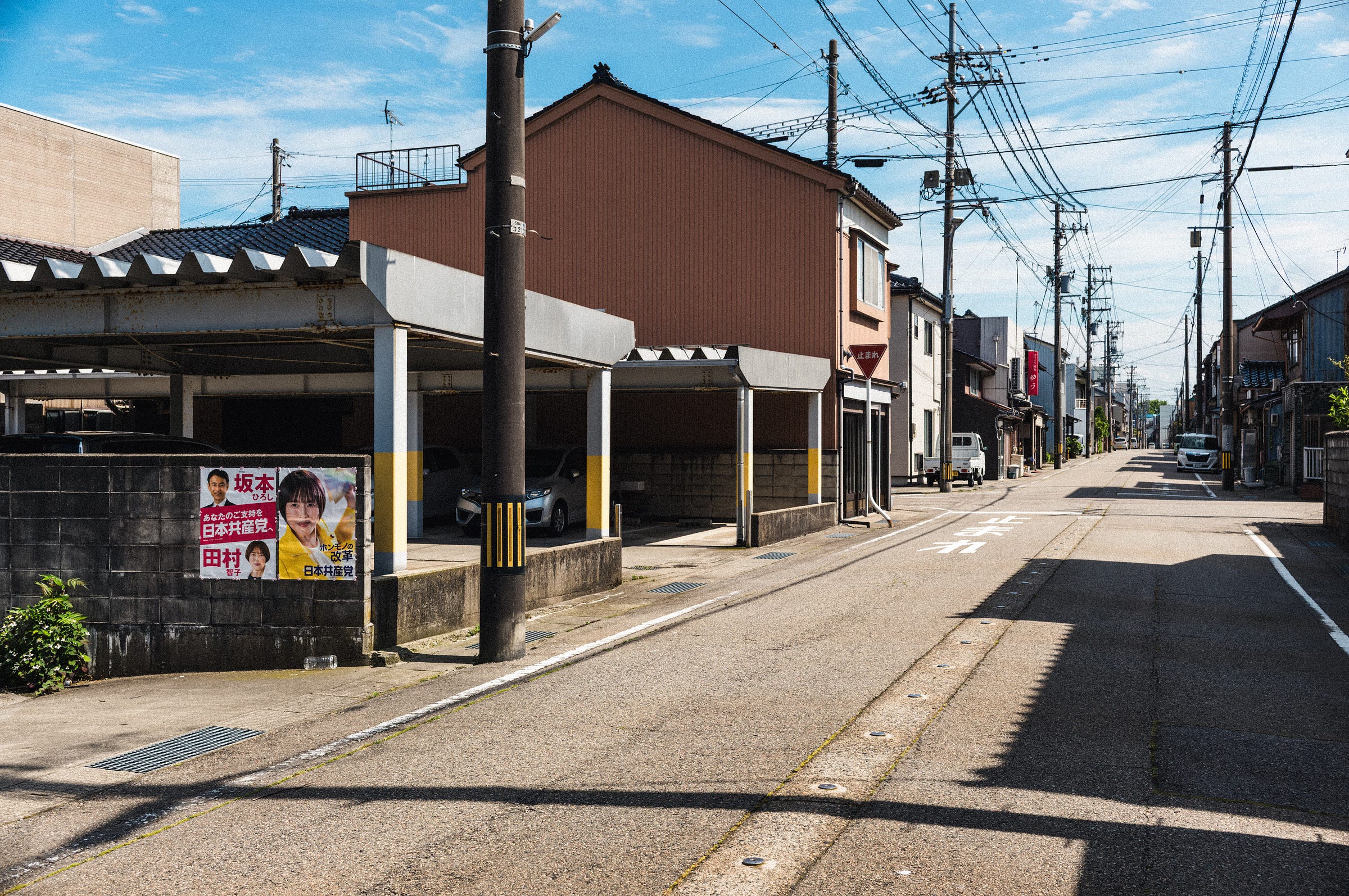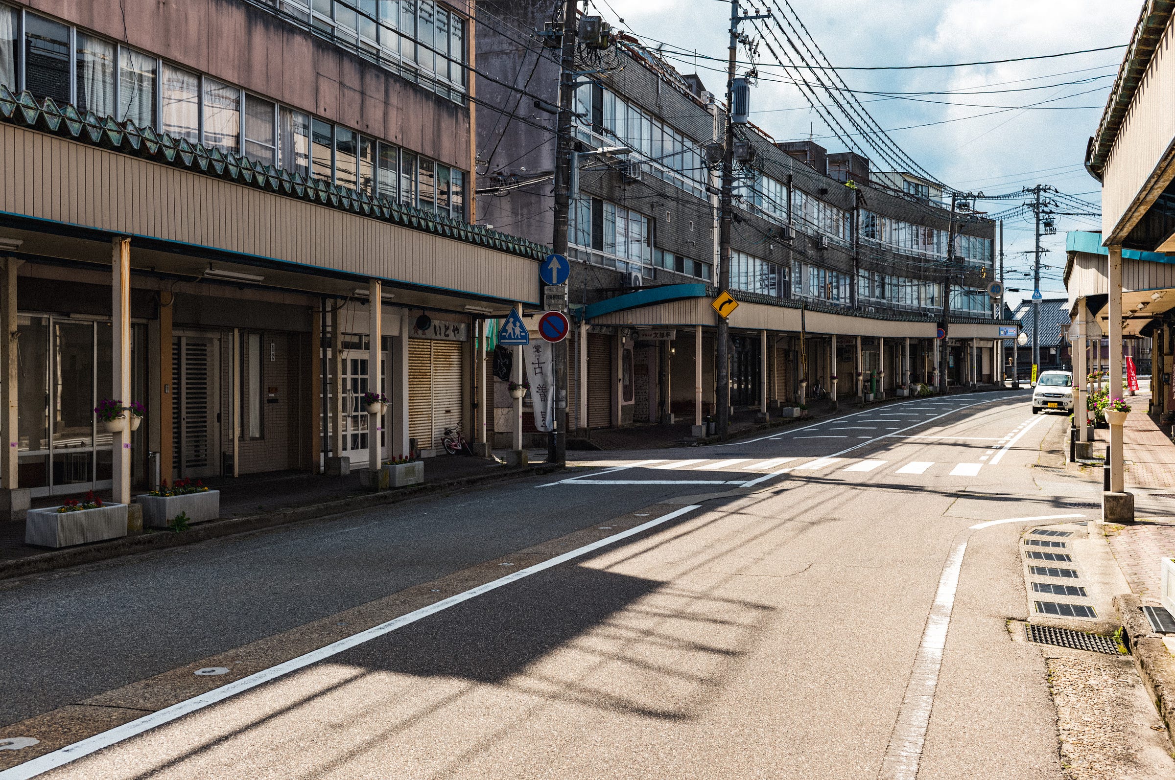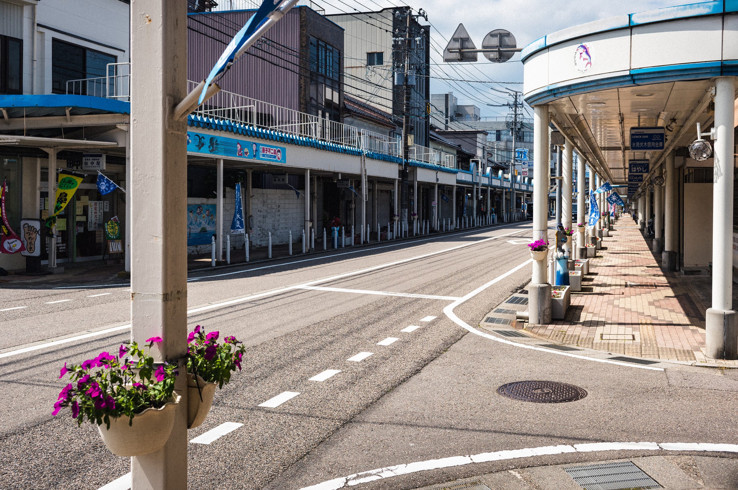 Himi City. A once-prosperous agricultural and fishing port town surrounded by idyllic nature, Himi shows the unmistakable signs of modern Japan’s post-Bubble-era fall from re-industrialization. With a general move towards centralization of industry to the main urban centres, modern heavy industry and tech. all but cease to exist here and the once thriving shotengai enclosed shopping streets and Ginza districts now sit empty and eerily quiet. Empty and desolate, shuttered-up shop fronts well past their prime dot the landscape; the signage and typography that remain hark back to a more colourful time, where optimism and local tourism were high and the bubble had not yet burst. A perfectly preserved relic, with Showa-era soft tunes and muzak drifting in from the still-operational PA megaphones and speakers—surprisingly crisp—yet playing to no one at all.